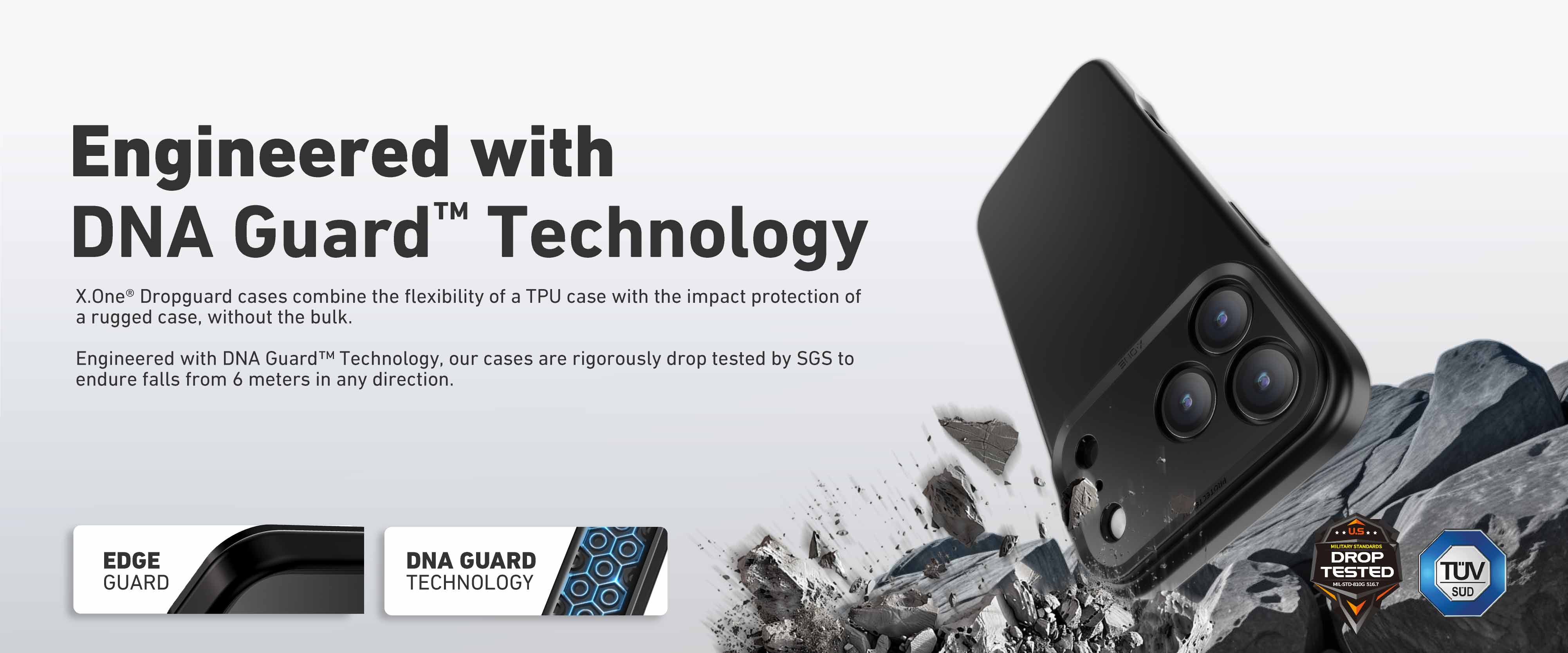 Introducing X.One Shock Dominator, minimalist design case with a leather matte feel finishing. Engineered with DNA Guard™ Technology, this case withstands drops from up to 20ft, rigorously tested and certified by TÜV and SGS.